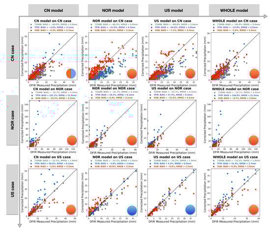 The transferring performance of the XGB precipitation correction method between different sites in Norway (NOR), the United States (US), and our study area in China (CN). The X-axis represents the trained model in CN, NOR, and US, while the Y-axis represents the site cases in CN, NOR, and US. Each subfigure displays the result of the trained model applied to a specific site. For example, ’CN model on US case’ indicates that the trained CN model using CN data was applied to correct the US case. The WHOLE model was trained using the training data from NOR, US, and CN. The XGB results (in red) are the uncorrected T200B or single-alter gauge observation (in grey) and the traditional TFM correction (in blue) are scattered. The BIAS and RMSE are listed in each subfigure. A solid cycle located in the lower-right of each subfigure indicates if the XGB model outperforms the TFM model, with orange meaning the XGB model outperforms the TFM model in RMSE and BIAS, and blue meaning the opposite. Half blue and half orange indicate that the XGB model outperforms the TFM model in one of the RMSE and BIAS metrics.