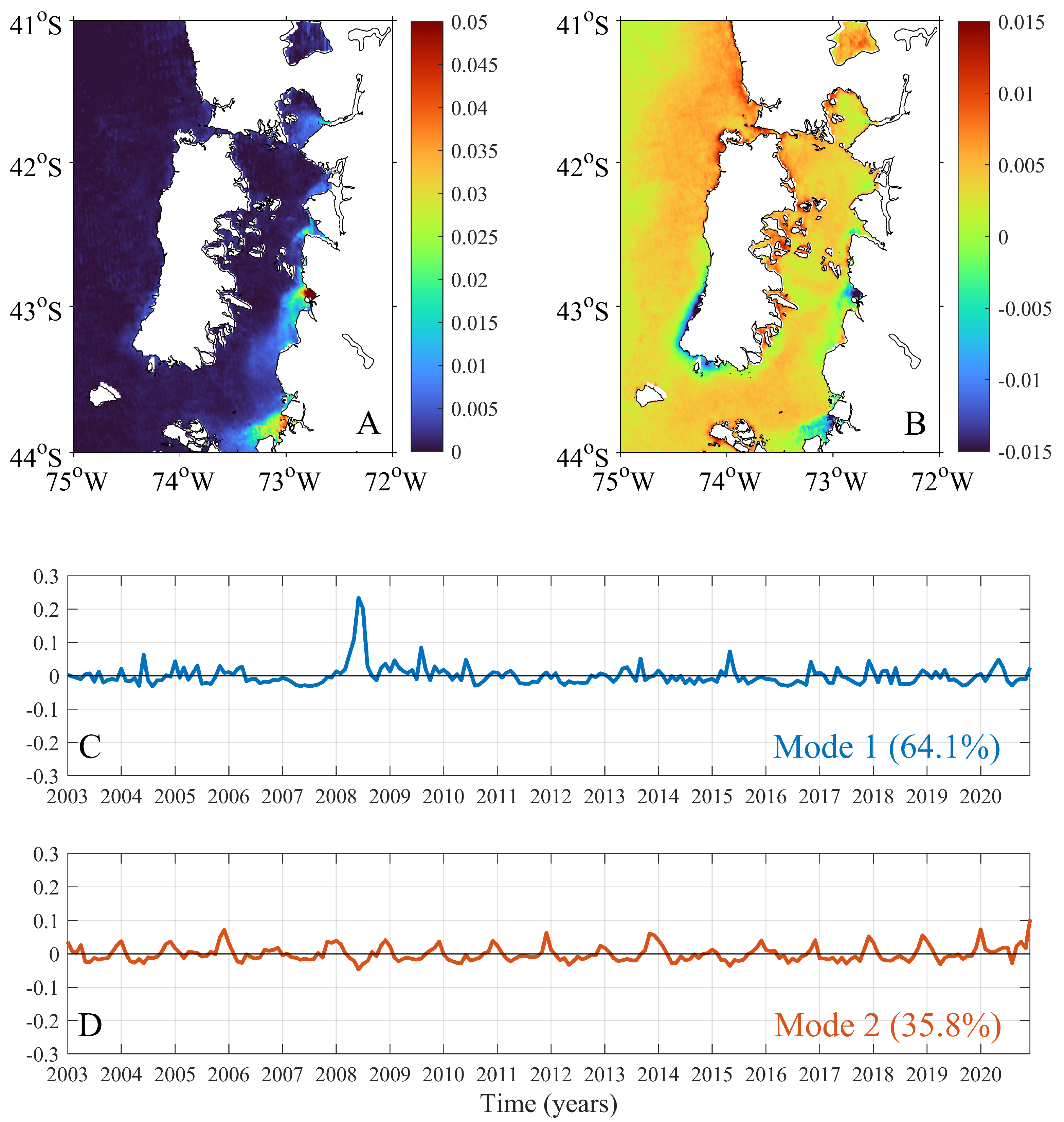 Muñoz R, Lara C, Arteaga J, Vásquez SI, Saldías GS, Flores RP, He J, Broitman BR, Cazelles B. Temporal Synchrony in Satellite-Derived Ocean Parameters in the Inner Sea of Chiloé, Northern Patagonia, Chile. Remote Sensing. 2023; 15(8):2182. https://doi.org/10.3390/rs15082182
