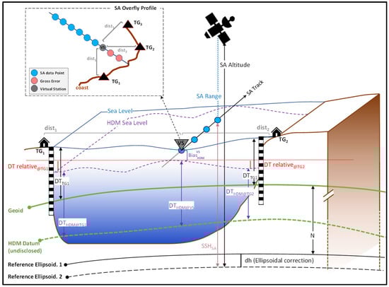 Accurate and consistent absolute sea level determination is a fundamental indicator of changes in our climate and is applicable in many research disciplines, including hydrogeodesy and oceanography. It is well known that sea level can be deduced from different sources, including tide gauge (TG) stations, hydrodynamic models (HDMs), and satellite altimetry (SA) []. These data sources, whilst capable, often refer to different vertical datums with different spatio-temporal resolutions []. For instance, for SA derived sea surface heights (SSH), the vertical reference is the ellipsoid, whereas TG data may refer to a geoid (equipotential surface of the earth) or mean sea level (MSL), and the vertical datum of HDM can often be undisclosed (Figure 1) and generally may have a bias that varies both spatially and temporally with respect to the records of nearby TG stations [,]. These differences often make it challenging for comparison and consistency among the sources. Consequently, this hinders the full understanding of continuous sea level variations from coast to offshore.