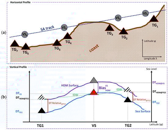 A VS intends to represent the k-nearest TG stations at a SA pass. The nearest TG (hourly, t) readings are interpolated (interp) linearly at the time of SA overfly cycle time (), whereas the relative DT () is added to this to retrieve DT at the location of the VS (). The is the difference between the HDM-based DT at the location of the VS ( and that at the location of the TG (). The could provide more realistic DT of TG readings at the location of the VS rather than simple interpolation (cf. Figure 2b) since the assumption is that the HDM is providing a reference base surface sea level, not a precise one. By adding the to the timewise-interpolated , the is obtainable. The adjacent (Figure 2b red triangle) to the VS are averaged using IDW [] to yield the DT at the VS location (), which now can be used to determine the bias of the HDM.
