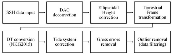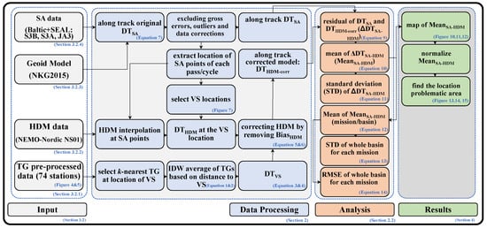 Equations (12)–(14) provide statistics for each SA mission. The RMSE and STD are commonly used to examine both along-track and mission/basin SA data quality. They provide statistically meaningful estimates of accuracy at a given location or the whole basin via different SA missions. Different SA missions’ data were not merged in this study; therefore, the range of m varies for each mission. The particulars of the used datasets are explained in Section 3. Figure 3 shows the flowchart of the applied methodology and data processing steps.