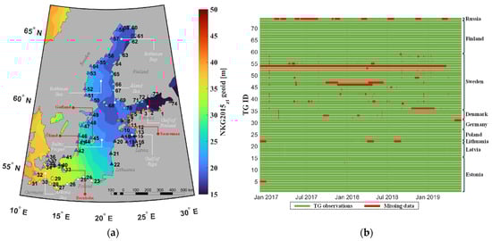 The Baltic Sea has one of the world’s densest observational tide gauge networks with remarkably long-term and high-quality local sea level records []. Within the study area, 74 TG stations (Figure 4a) were selected to have suitable locations near satellite tracks. The details of each TG station per country can be found in Table 1. An identification number (ID) was assigned to each TG station; the relevant details are given in Appendix A Table A1 as well.