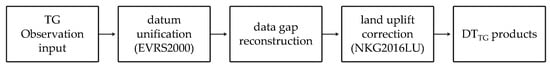 Since TGs measure relative sea level with respect to land, their measurements are required to be corrected for VLM in order to obtain absolute sea level. In the Baltic Sea region, vertical land motion is due to geophysical GIA and varies from -1 mm/year in the Arkona Sea to 10 mm/year in the Gulf of Bothnia []. In this study, the land uplift effect was removed from TG observations using the NKG2016LU model. This model includes the latest GIA land uplift model for the Baltic Sea region developed by the Nordic Commission of Geodesy (NKG, www.nordicgeodeticcommission.com, accessed on 26 August 2021). It covers an area from 49° to 75°N and 0° to 50°E []. The VLM corrections (from the reference time epoch, i.e., 2000.0) were applied from the model (linearly interpolated at the location of TG) by adding it to the TG readings (to the observation time epoch) []. During the selected time span of 2017–2019, some TG hourly data gaps exist, as can be seen in Table 1 and Figure 3b. These gaps were filled using highly correlated adjacent TG stations to reconstruct gap-free TG data, cf. []. Figure 5 shows the steps for the TG observation reconstructions. In further steps, TG#33 was excluded from the dataset due to data inconsistency with the other TGs.