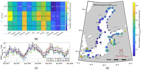 Statistics of HDM discrepancies with respect to participating TG stations. (a) Means (characterized by the circle size) and standard deviations (characterized by the colors) of discrepancies between HDM and TGs (Equations (16) and (17)) during 2017–2019 over the Baltic Sea. (b) Monthly average of HDM discrepancies over three years (Equation (16)). (c) Monthly average of HDM discrepancies at six selected TG locations (one station in each country with the largest STD or mean). TG IDs are explained in Figure 4a as well as in Table A1 (Appendix A).