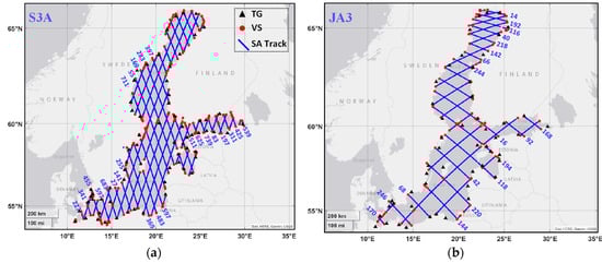 Coverage of SA passes within the study area. (a) Sentinel 3A (note that S3B has almost the same track patterns) and (b) Jason-3 missions. For each mission ascending pass numbers are shown. The locations of VS and TG stations are denoted by red circles and black triangles, respectively.