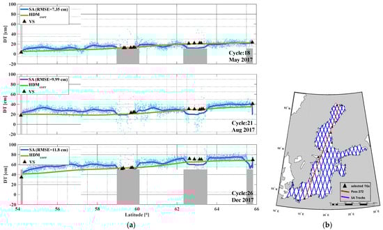 (a) Comparison of S3A pass #272 (blue dots) with the TG-corrected HDM () (green line) for 3 cycles (representing different seasons) in 2017. The moving average is denoted by the blue solid line, the grey zones showing masked near coast and land areas, and the triangles denote locations of virtual stations; (b) the location of the S3A pass #272 in the Baltic Sea.