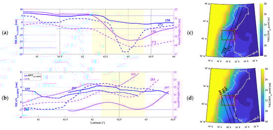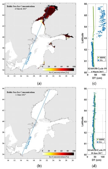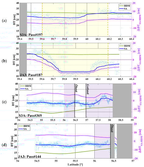 Figure 9 displays an example of the along-track for the S3A pass #272, which stretches from the southwest to the northern Baltic Sea and represents a reasonable example of the HDM and SA data quality and values (Figure 9b). In this figure, three cycles (18, 21, and 26 in 2017) of for this pass are compared with the (green line).