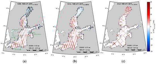 As mentioned earlier, the focus of this study is to explore a developed methodology to estimate accurate DT in the Baltic Sea using a synergy of SA, corrected HDM, a dense TG network, and a high-resolution geoid model. The Baltic Sea is a semi-enclosed shallow sea in northern Europe that is heavily influenced by a massive density of marine traffic, coastal activities, port development, and sub-mesoscale marine dynamics []. Thus, knowledge of accurate DT variations in the Baltic Sea is critical for many reasons (e.g., consistency amongst data sources, sea level trends estimate, derivation of currents, etc.). In addition, since no sea level source is perfect (mentioned above with respect to the limitation of HDM and SA), but given that they all refer to the same vertical datum, this now allows a logical inter-comparison to be performed. By performing statistical analysis, this comparison has the potential to identify the problematic areas of the sea level sources utilized. Note that the sources of these problematic areas are only provisionally explored in this study to demonstrate the usefulness of DT and the benefits that the synergy of different sources of sea level data can indirectly reveal. For a more detailed understanding of these sources, more resources are required that are out of the scope of this study but can be pursued for future studies. Note that the other sources of sea level from which DT can also be derived consist of shipborne GNSSs (global navigation satellite systems) and airborne laser scanning profiles. For instance, Ref [] used airborne laser scanning profiles for determining DT. In addition, Ref [,] used shipborne GNSS profiles for determining DT over the Baltic Sea. Usage of these other sources are, however, restricted by their spatial and temporal resolution.