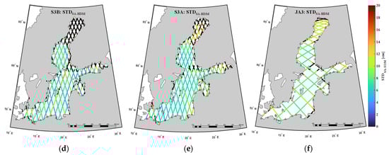 In this study, more than 4 million S3A/3B and JA3 data points (Table 3) along 116 passes during 2017–2019 (131 cycles) were extracted from Baltic+SEAL 20 Hz data products. These SA passes cross 74 nearby TGs; see Table A2 and Table A3 in the Appendix A. The numbers of used TGs are at maximum 16, at minimum 2, and 6 stations on average for Jason-3 tracks and 13, 2, and 6 for Sentinel-3 tracks, respectively (cf. Table A2 in the Appendix A). Table 3 shows the main statistics of these datasets. The SA data points out of the HDM coverage (near the coastline) were excluded (cf. the number of outliers in Table 3) for the consistency of the datasets. The number of locations represents the persistent locations of SA data points in the cycles. The used different SA data periods are also summarized in Table 3. Although the S3B mission was launched in April 2018, the start of usable data is in November 2018. Thus, the S3B data before November 2018 were excluded in this study. Accordingly, in statistical evaluations (by Equations (10)–(12)), 92 cycles of JA3 (whereas the number of qualified cycles m = 82), 33 cycles of S3A (m = 29), and 7 cycles of S3B (m = 6) over 3 years (2017–2019) were investigated.