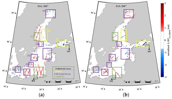 Several components based on different time frames affect the sea level dynamics in the Baltic Sea. With respect to the long term, the global sea level change (due to thermal sea water expansion and the melting of glaciers) will influence the Baltic Sea’s level, whilst the variation in temperature, precipitation, and evaporation is expected to mostly exert influence on a decadal time scale []. For short-term influences (yearly, seasonally, daily, etc.), variations in the water balance caused by water exchange in the Danish Straits (e.g., saltwater intrusions from the Atlantic (Major Baltic inflow)) that are driven by atmospheric conditions may cause drastic sea level changes. River runoff also affects the water balance, with the biggest freshwater contributor being the Neva River located on the eastern side of the Baltic Sea []. It is common in winter months for the Baltic Sea to become ice-covered; the number of sea ice days also changes the dynamics of the sea level []. Ice coverage is common in the winter months for the Baltic Sea, especially in the northern (Gulf of Bothnia) and eastern sections (Gulf of Finland). This also has been a challenge for SA in determining the sea surface. However, improved SA coastal retrackers are expected to provide better data products over this region, e.g., Baltic+SEAL [].