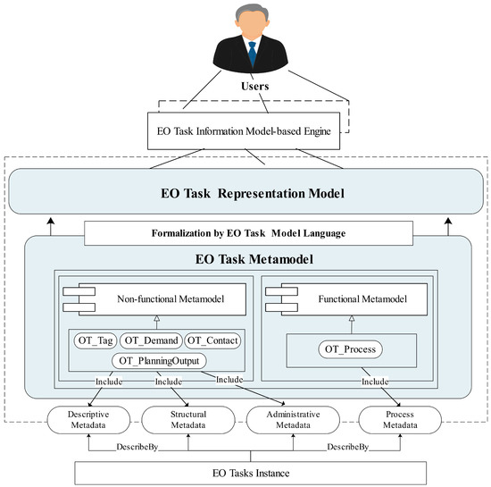Metamodel framework of earth observation task representation. EO task instances are represented at multiple levels by corresponding specific metadata collection types. A standard representation model of the EO task is constructed based on the EO task metamodel.