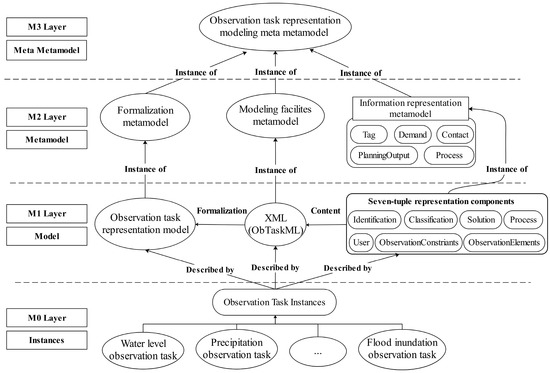 Figure 2 depicts the EO task representation of the metamodeling architecture. This representation has four levels. The M0 layer comprises EO task instances, such as water level, precipitation, soil moisture, and flood inundation area observation tasks. The M1 layer, which is composed of a model, is an instance of the M2 layer. It includes five EO task demand description components, an EO task model language (EObTaskML) and the observed task representation model. The M2 layer consists of the following metamodels: formulation, modeling facility, and information representation metamodels. These metamodels are the abstract representations of the EO task representation model, EObTaskML, and the task information description components, respectively. Finally, the concepts and relationships of the EO task are defined by the M3 layer. This layer is embodied by the M2 layer.