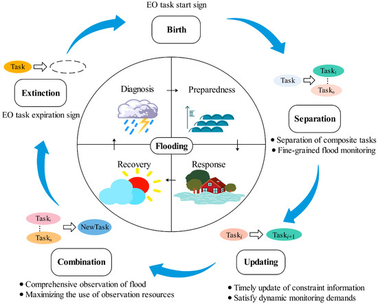 (1) Birth: This process signifies the start of the EO task. Different flood stages have varying monitoring tasks. For example, the diagnosis phase focuses on monitoring water conditions and recognizing the distribution of roads, residential areas, and other facilities. Meanwhile, the preparedness phase predicts the spatiotemporal information of a flood.