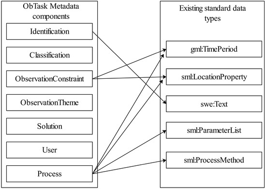 To enhance the compatibility and efficiency of EO observation task representation, several existing standards are reused to convert the EO task metamodel (EOTM) into a formal representation. They include the Geographic Markup Language (gml) [46], SensorML (sml) [47], and the SWE common data model (swe) [48]. The corresponding mapping relationships are as follows (Figure 5).