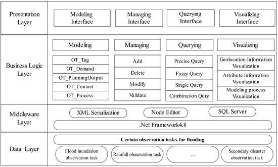 The EO-TMMS architecture has four layers: data, business logic, middleware, and presentation layer (Figure 6). Information about EO tasks for flooding (e.g., flood inundation and rainfall observation tasks) is contained in the data layer. The middleware layer is in charge of promoting the serialization, storage, search, and visualization of EO task representation models. The core of the system is the business logic layer, which defines EO task modeling, management, querying, and visualization. Lastly, a series of user interfaces through which users can interact with the system is provided by the presentation layer. This layer also completes the business logic and operations defined in the business layer.