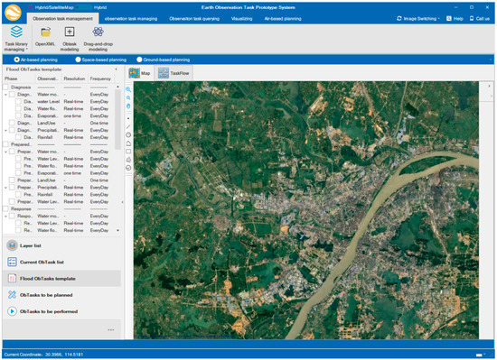 A prototype system, namely, the earth observation task modeling and management system (EO-TMMS), is designed and implemented for flood scenarios in this section. EO-TMMS realizes a unified organization of different EO tasks at various stages of flooding observation task demands on the basis of the EO task representation model.