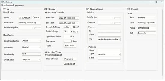 Figure 7 shows the interface of the prototype system, which includes the EO task modeling, management, query, and visualization modules. The modeling module provides a template interface to the observation task demand information. It allows users to set EO task information immediately (Figure 8). Users fill in the EO task information, which is organized as the metadata structure of an EO task. The management module manages the established EO tasks, supports the modification of the content of the model file, and verifies whether the model follows the metamodel pattern of an EO task. A variety of EO task queries are supported by the query module to satisfy a specific EO task query requirement. Lastly, the visualization module displays the geographical location and related attributes of selected EO tasks. The results are displayed in the main interface. This module also supports intuitive, drag-and-drop process modeling for facilitating subsequent EO task planning.