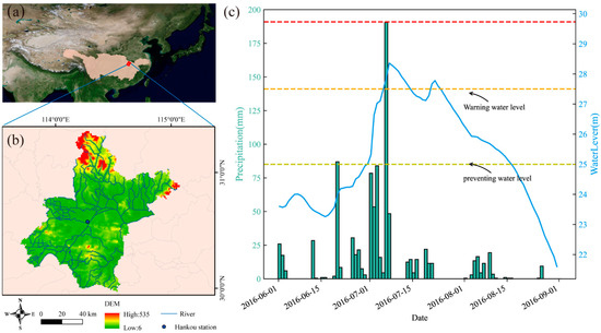 Experimental scenario. (a,b) Study area and (c) rainfall and water level variation at the Hankou Hydrological Station.