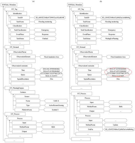 Segments of earth observation task representation instances (part). (a) Flood inundation observation task and (b) updated flood inundation observation task (the red circle shows the updated time and space information).