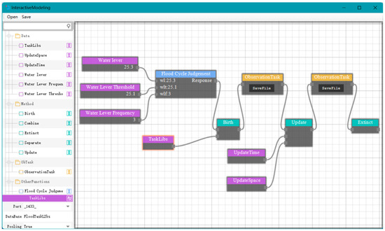 The drag-and-drop modeling of the EO task process is illustrated in Figure 11. The modeling process can be achieved by dragging the components on the upper left side on the basis of the node editor (https://github.com/DebugST/STNodeEditor (accessed on 22 March 2023)). Some related objects are encapsulated into the components (e.g., data and methods). The user can avoid tedious operations by dragging these components to the right canvas to realize the simple and fast observation of task process settings.