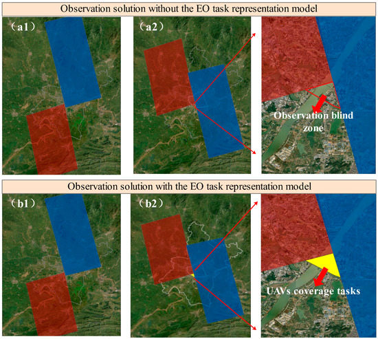 Effect of observation task observation representation model on the observation coverage. (a1,b1) Coverage of unchanged task demands, (a2) observation solution without EObTask after task demand change, (b2) observation solution with EObTask after task demand change.