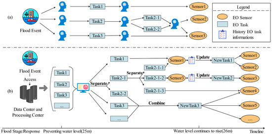 Figure 13 presents a comparison between the models with and without the task process. The proposed EO task process considers EO task dynamic demands and the full process of a flood. Compared with the EO task model without a task process, it exhibits the following advantages. (1) The efficiency of using EO sensor resources can be improved by the combination process. (2) Accurate and fine-grain monitoring can be achieved by the separation process. (3) The updating process can support dynamic observations, and, thus, the uncertainty associated with the manual generation of tasks is reduced. Relevant data can be obtained in time to assist decision makers if the observation of disasters is integrated and dynamic. In this manner, human casualties and economic losses may be reduced.