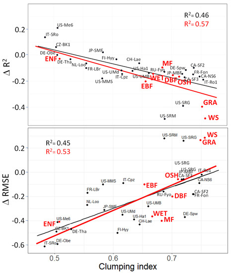 - Chen, J.M.; Mo, G.; Pisek, J.; Liu, J.; Deng, F.; Ishizawa, M.; Chan, D. Effects of Foliage Clumping on the Estimation of Global Terrestrial Gross Primary Productivity. Glob. Biogeochem. Cycles 2012, 26, 1019. [Google Scholar] [CrossRef]
