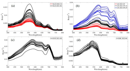 Remote-sensing reflectance data collected from (a) XLD, (b) LHH, (c) SYH, and (d) DJK.