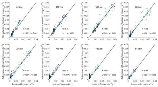 Scatter plots of the reflectance of the Sentinel-2 satellite in eight bands (443, 490, 560, 665, 705, 740, 783, and 842 nm) against the measured reflectance. The correlation coefficient (R) was used to evaluate the accuracy of the Sentinel-2 Rrs data. The black diagonal line is the 1:1 line.