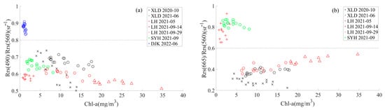 Sampled data classified according to the algorithm in Section 3.1 and the Rrs band ratios (a) Rrs490/Rrs560 and (b) Rrs665/Rrs560.