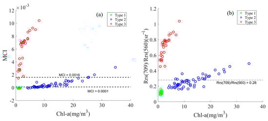 Classification of water into (a) three types according to MCI thresholds (0.0001, 0.0016) and (b) two types according to the R709/R560 algorithm (0.28). Green, blue, and red circles indicate the three OWTs in this study, corresponding to Types 1, 2, and 3, respectively.