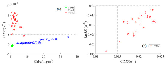 CI672, R555, and CI555 classify waters into Wp, Wd, and Wm types. These are similar to the water body classification results in this study, with only two data points in error (Figure 8). This algorithm classified Type 1 and 2 waters as class Wp and Type 3 mostly as Wm. This basically corresponds to the classification of water types in this study, but the very different peak–valley responses of Type 1 and 2 waters in the blue band indicate that these are two water types (Figure 6). However, for waters with R555 < 0.04 sr−1 and CI555 < 0.015 sr−1, there is a lack of delineation, resulting in the inability to classify all waters (Figure 8b). The estimation algorithm used for this classification is the absorption algorithm related to Chl-a, which was not implemented in this study owing to a lack of data.