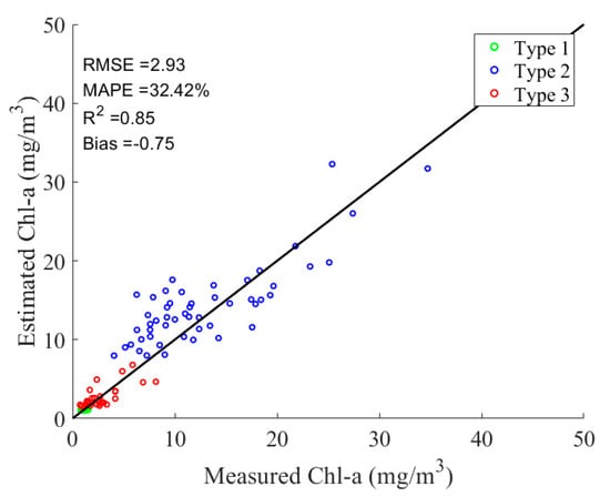 The band ratio chosen for Type 1 waters was Rrs665/Rrs490, and the results for a, b, and c were 4.36, −1.32, and 1.11, respectively. The band ratio chosen for Type 2 waters was Rrs705/Rrs560, and the results for a, b, and c were 178.23, −58.46, and 12.76, respectively. The band ratio chosen for Type 3 waters was Rrs842/Rrs665, and the results for a, b, and c were 35.63, −7.86, and 1.84, respectively. Based on the classification in Section 4.2 and the hybrid method designed in Section 3.2, the Chl-a estimation results of three OWTs were obtained with a total accuracy R2 of 0.85 (Figure 9).