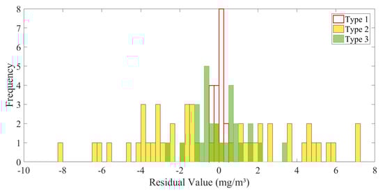 where Vmeasured,i is the measured value in the field, Vestimated,i denotes the value deduced from the proposed algorithm, and N is the number of samples. The units of MAPE, RMSE, bias, and RV are percent, mg/m3, mg/m3, and mg/m3, respectively.