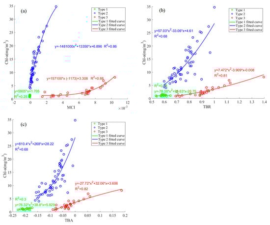 Relationship between the Sentinel-2 satellite band modified methods (a) MCI, (b) TBR, and (c) TBA and measured Chl-a of three OWTs based on the band-ratio water classification. Green, blue, and red circles indicate the three OWTs in this study, corresponding to Types 1, 2, and 3, respectively.
