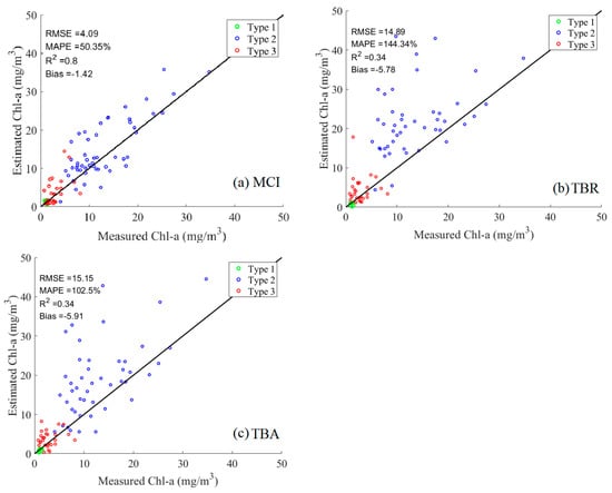 Scatter plots of measured Chl-a and Sentinel-2 estimated Chl-a based on the modified method (a) MCI, (b) TBR, and (c) TBA (n = 99). Green, blue, and red circles represent the three OWTs based on the band-ratio water classification algorithm proposed in this study, corresponding to Types 1, 2, and 3, respectively. The black diagonal line is the 1:1 line. The units of RMSE, MAPE, and bias are mg/m3, percent, and mg/m3, respectively.