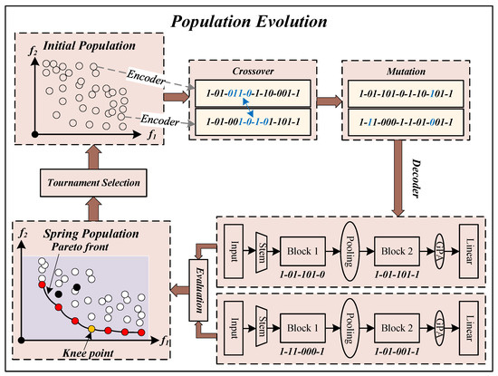 Figure 2 depicts a schematic diagram of population evolution. Consistent with the paradigm of a genetic algorithm, the population evolution is primarily made up of crossover and mutation, evaluation, as well as selection. First, individuals in the initial population are randomly selected for crossover. Then, crossover and mutation operations are performed on the selected individuals to obtain offspring individuals. Finally, all new individuals are evaluated and a new generation population is selected. This process is looped until the stop condition is met. We describe crossover, mutation, evaluation, and environmental selection in detail below.