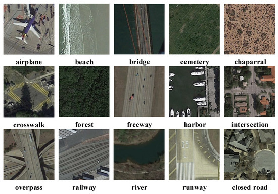 The spatial resolution of the UCM21 dataset is fixed at 0.3 m. The spatial resolution of the PatternNet dataset has a small range of 4.63 m, while the NWPU45 dataset has a large range of 28.8 m. Some samples are shown from the three datasets in Figure 3, Figure 4 and Figure 5, respectively.
