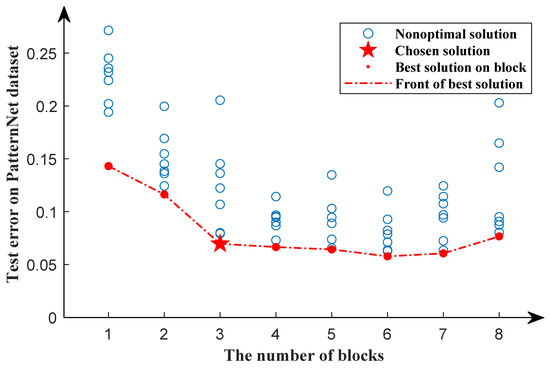 To determine the optimal depth in the remote sensing image classification model, we first select the highest classification accuracy from individuals outputted by population evolution in Section 2.2.3. This will form the optimal solution front. Then, the knee point method [63] is used to select the optimal solution from the optimal solution front. Finally, we determine the optimal depth of the model by calculating the number of blocks in the optimal solution.