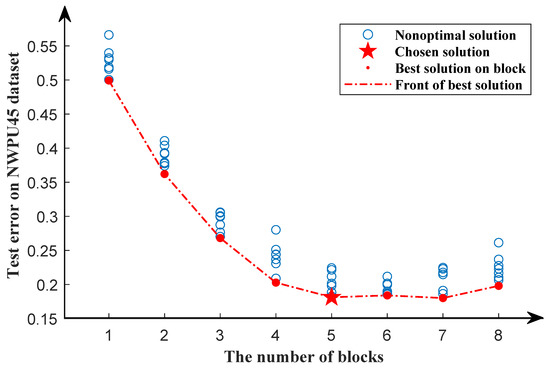 In the first search phase, 80% of data in the UCM21 dataset are randomly divided as the training dataset, and the rest as the testing dataset by a stratified sampling algorithm. The search results of the first search phase are shown in Figure 6. The red dotted line shows a downward trend as the number of blocks increases and stabilizes when the number of blocks equals five. We can see that as the number of blocks increases, the classificatin error rate of the model decreases. However, after the number of blocks is equal to five, the classificatin error rate of the model does not decrease significantly, but increases slightly. As a result, in the first search phase, the optimal solution is chosen when the number of blocks equals five.