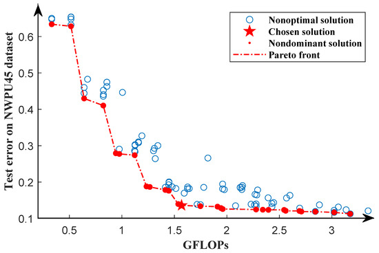 - In the second search phase, the two optimization objectives are the classification error rate and GFLOPs of the model. Therefore, when evaluating individuals as in Section 2.2.3, we evaluate the individual’s classification error rate and calculate the individual’s GFLOPs.