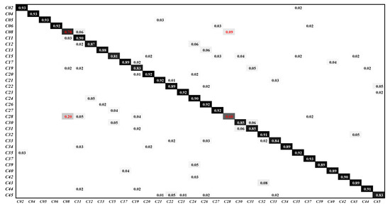OA indicates the overall classification accuracy of the model, which represents the ratio of correctly classified samples to all samples in the testing dataset. OA and CM are calculated using Equations (4) and (5), respectively, where S and denote all samples and samples of category c in the testing dataset, respectively; K indicates the number of categories in the testing dataset; is the indicator function; denotes the remote sensing image classification model; x denotes the input sample; denotes the label of the category c sample. CM is a matrix with K rows and K columns. denotes the proportion of samples of category i misclassified as samples of category j among all samples of category i in the testing dataset.