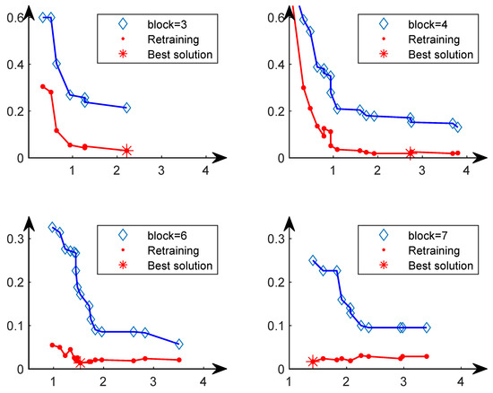 In the Pareto front obtained from the second search phase, we fully train each solution from scratch and then select the solution with the lowest classification error to compare with other methods. The reason is that after fully training from scratch, the solution with the lowest classification error may not be the solution with the lowest classification error in the Pareto solution set. Therefore, we conducted four sets of comparative experiments, as shown in Figure 17. In the upper left figure, after the solutions in the Pareto solution set with blocks equal to three are fully trained, the solution with the lowest classification error is the optimal solution in the Pareto set. However, the other three subplots show that after training completely from scratch, the solution with the lowest classification error is not the solution with the lowest classification error in the Pareto solution set. This further illustrates the rationality of our choice of the final solution.