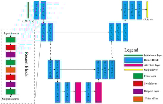 The architecture of the denoising model . The model is modified based on the U-Net architecture, and the original conv blocks are replaced by ResNet blocks and attention layers to enhance the detailed information of the inference images.
