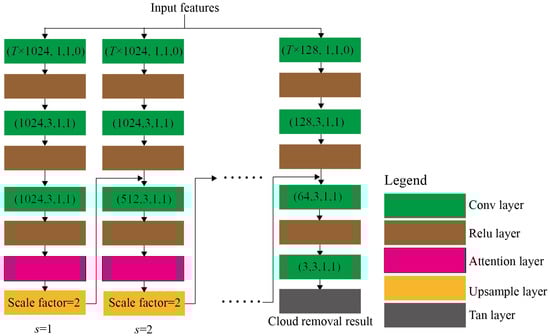 The attention loss function plays a crucial role in the cloud-oriented loss by integrating the features obtained from each attention layer in Figure 4 and generating a spatial attention matrix, which enhances the image regions of clouds and cloud masks at various scales as high salient values, improving the overall performance of the cloud removal task. denotes the L2 loss function, which is used to control the network to focus on the cloud removal task. After extensive experimentation, , , and are chosen as 0.8, 0.15, and 0.05, respectively, to balance different remote sensing image representations.