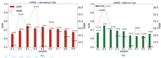 Weight selection for the comparative loss functions. (a) Presents the fluctuation of SSIM and PSNR metrics with different weights for mMAE + perceptual loss; (b) shows the influence of weights on the change trend of SSIM and PSNR metrics of mMAE + attention loss.