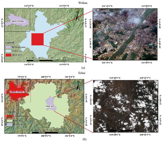 The presentation of two study areas. (a) Shows the preview of the Wuhan study area as well as the image of the partial urban region to estimate the performance of cloud removal methods. (b) The preview of the Erhai study area with natural and artificial landscapes. The color composition of the above study area images is based on natural colors (R: band 4, G: band 3, and B: band 2).