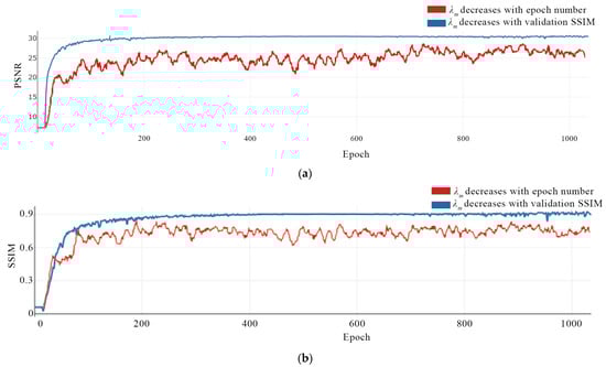 The relationship of accuracy metrics with epoch numbers in different λm adjustment strategies. (a) Depicts the variation in PSNR. (b) Shows the trend of SSIM. The red curve shows the strategy of λm decreasing with increasing epoch number. The blue curve means λm decreases according to the validation SSIM metric.