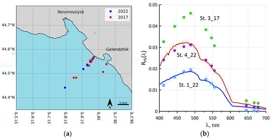 (a) Map of stations. (b) Examples of Rrs(λ) spectra measured using the floating spectroradiometer PRO-1 (solid lines) and calculated from MODIS data (circles).