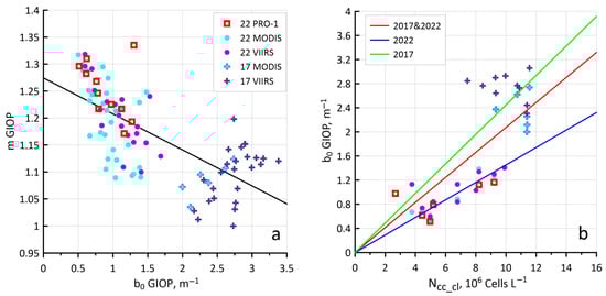 Comparison of scattering parameters and concentration of coccolithophores: (a) parameters b0 and m for coccolithophore backscattering, calculated by GIOP; (b) coefficient b0 and concentration Ncc_cl. Solid straight lines are linear regressions.